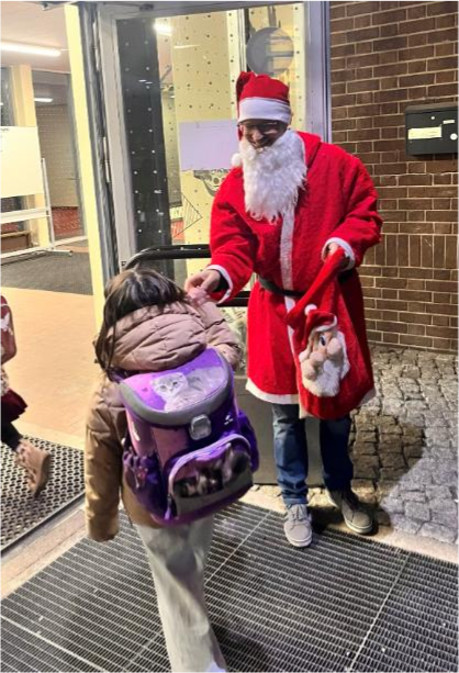 heute Morgen sorgte unser Förderverein für einen besonderen Start in den Schultag. Der Weihnachtsmann begrüßte alle Schüler*innen im Schuleingang mit einer kleinen Süßigkeit, freundlichen Worten und festlicher Weihnachtsmusik.